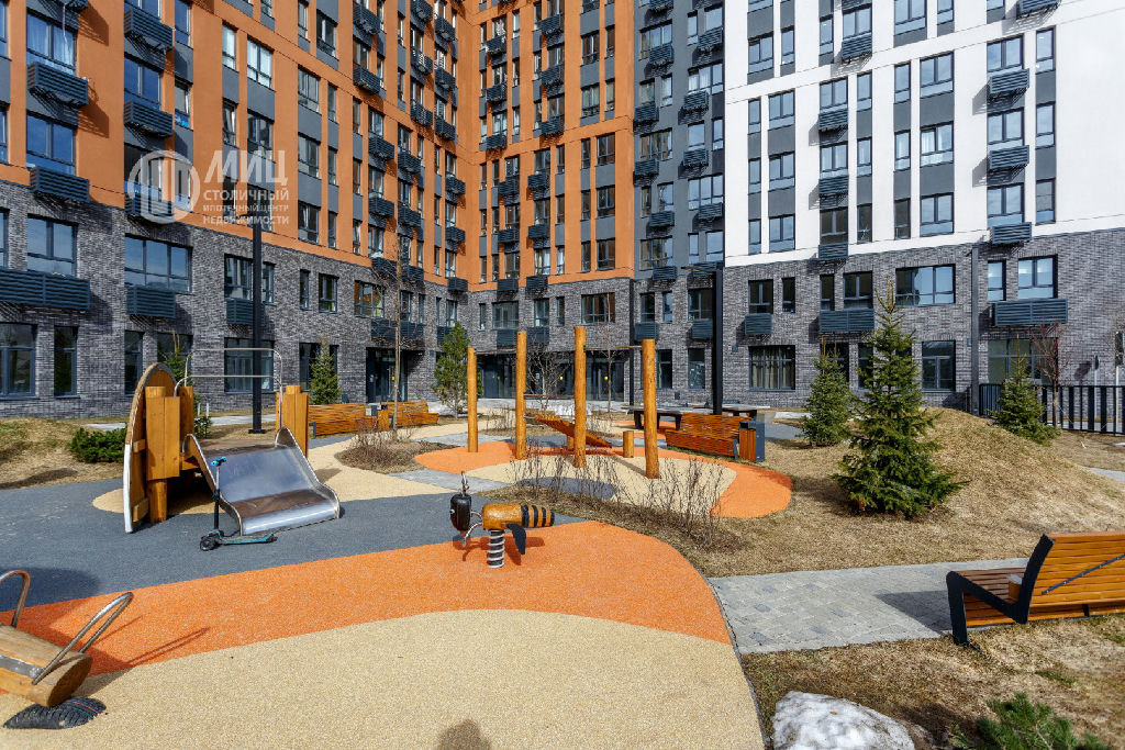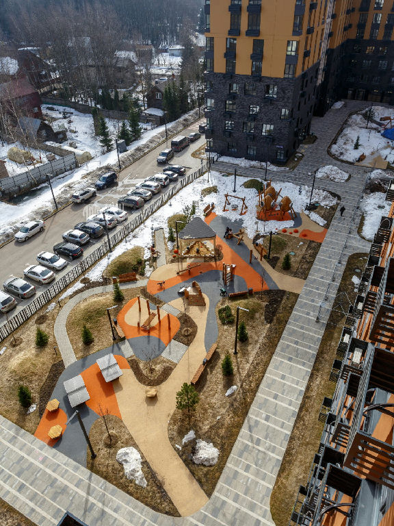 Огороженный двор без машин, во дворе установлены игровые и спортивные площадки.